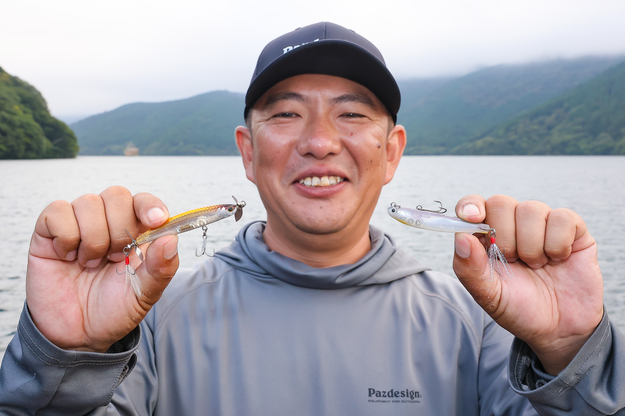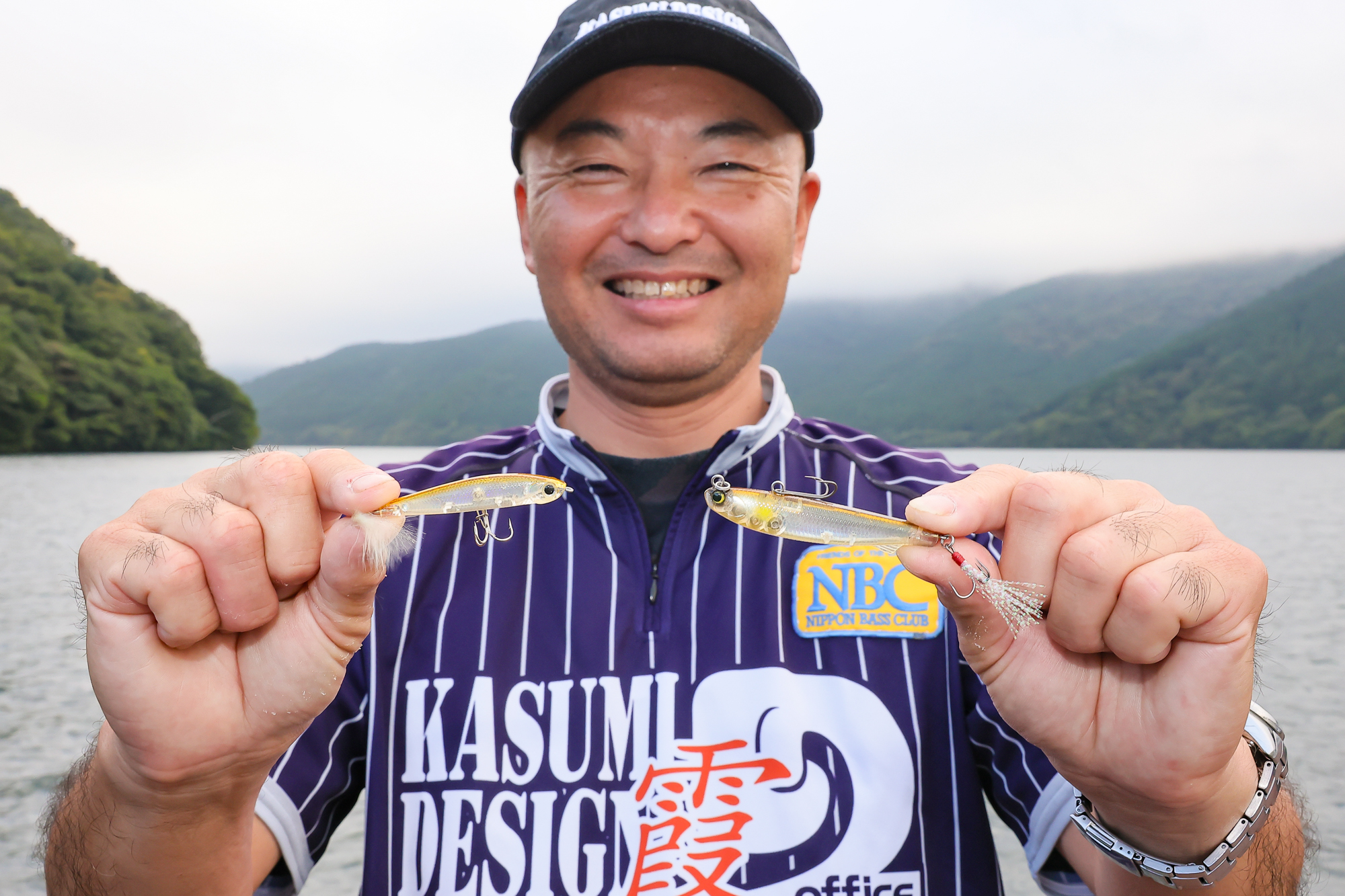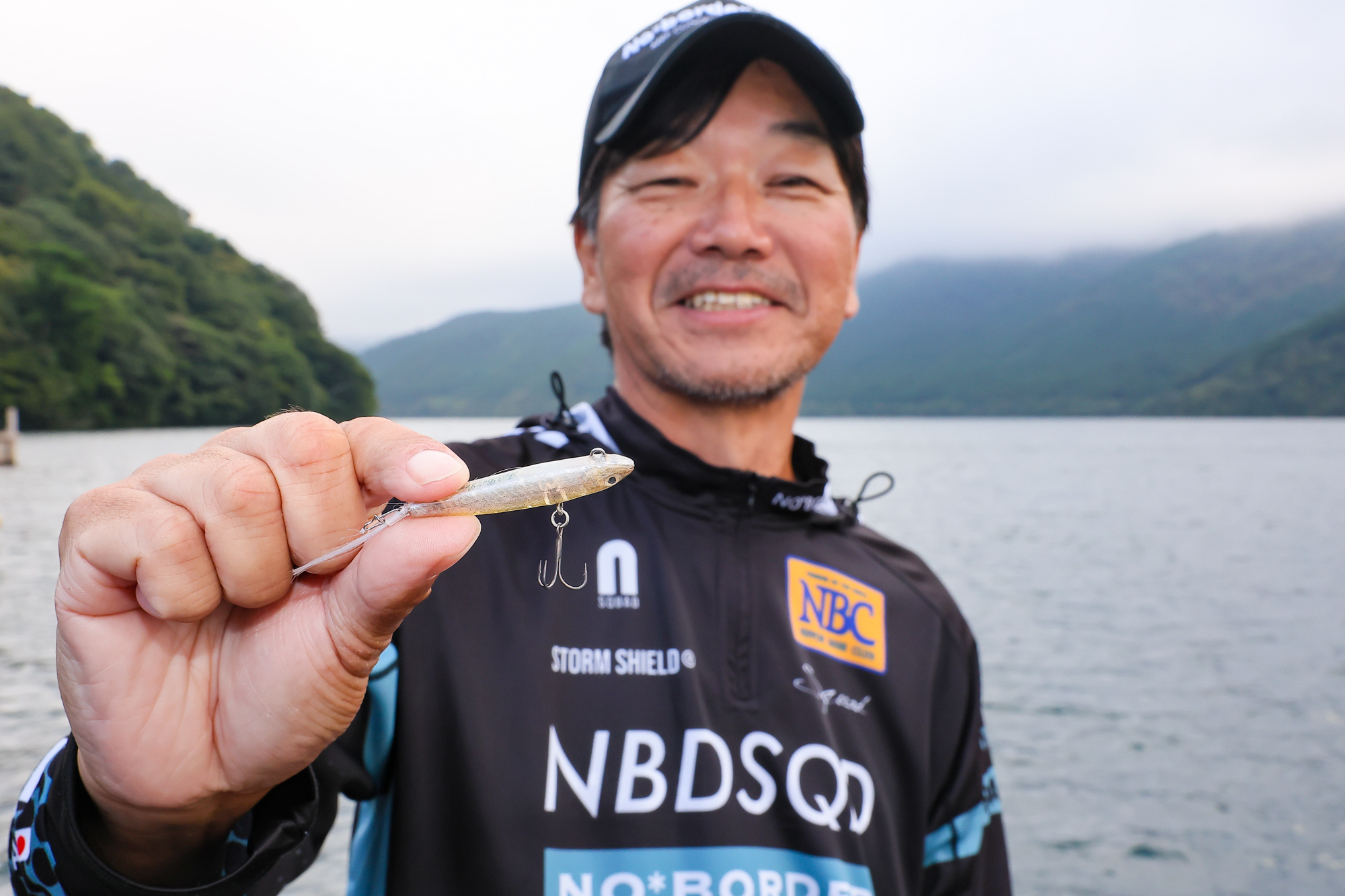 加藤選手はシャローにバスがいない状況で得意のサイトフィッシングが出来ないとみるや、岸からなるべく近くにいるワカサギ船を見つけ、その付近でバスがワカサギを岩盤や岩に追い込んでフィーディングしていると予測し、『グリマー7』と『デルゼ55SS』で水面付近と水中を攻め見事3匹4700グラムを釣り上げました!