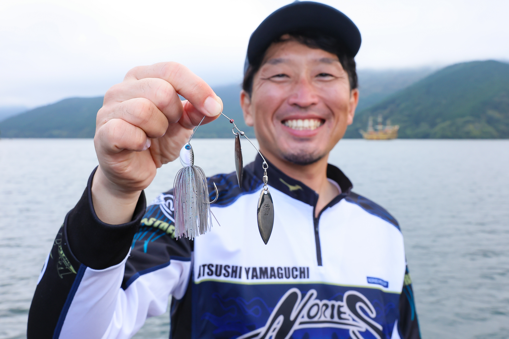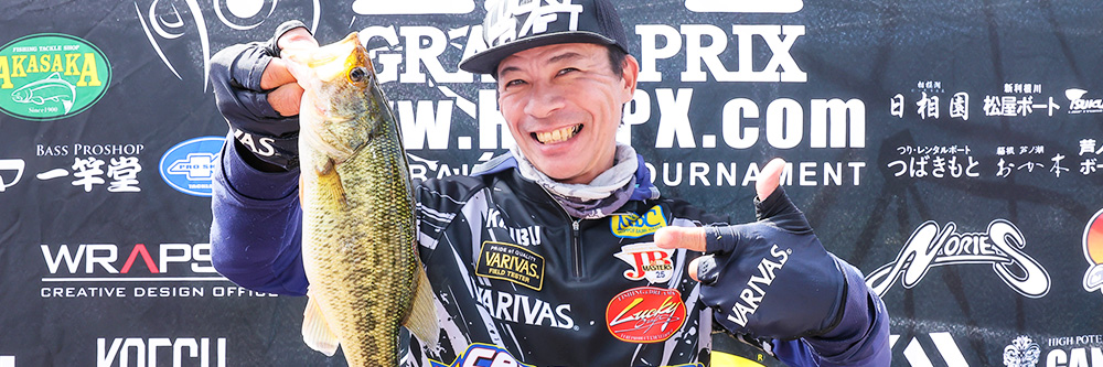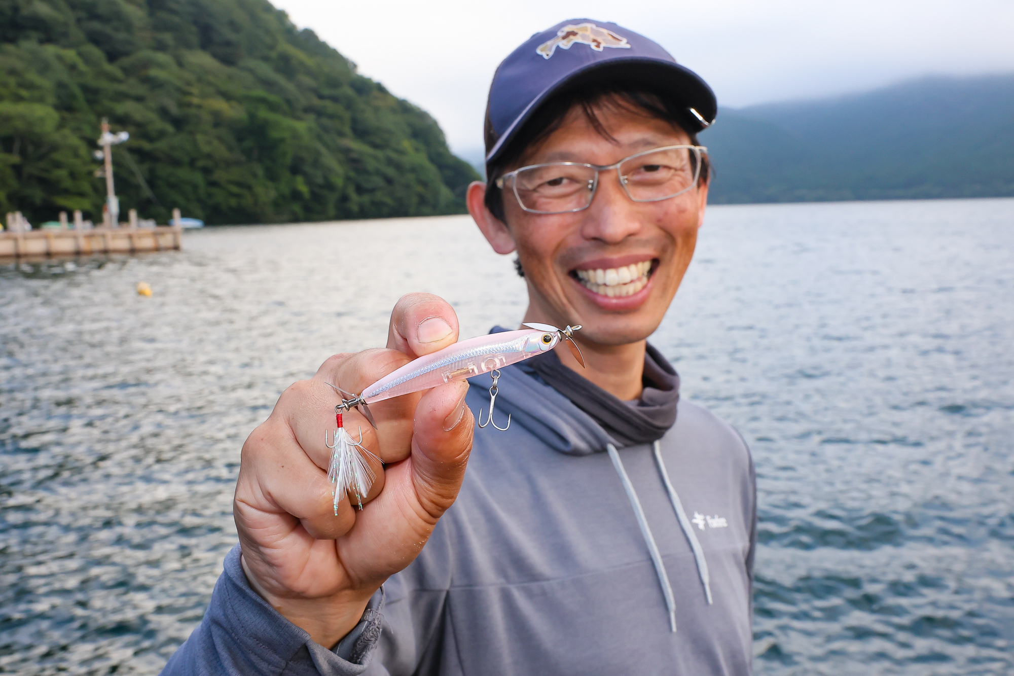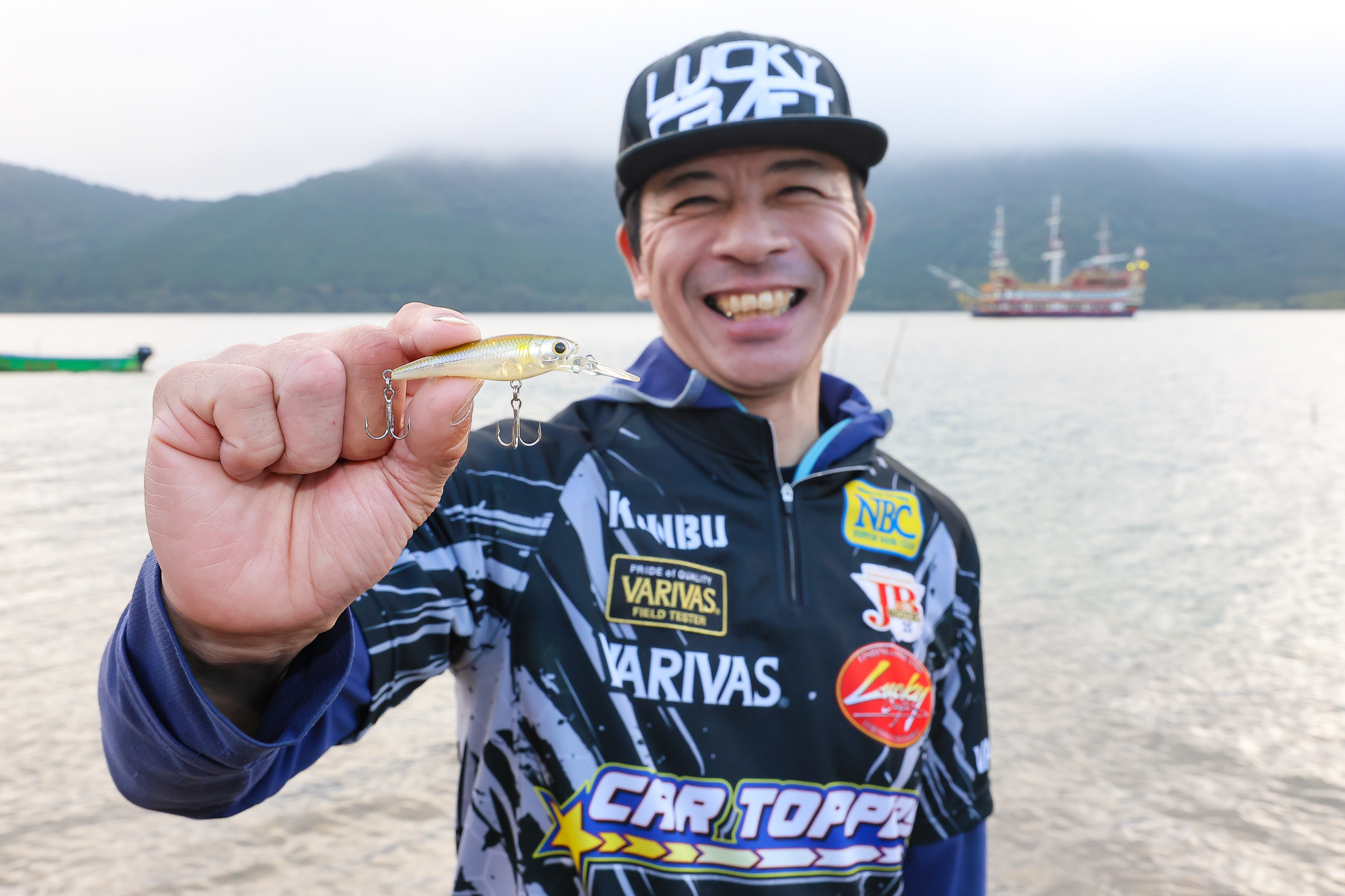 加藤選手はシャローにバスがいない状況で得意のサイトフィッシングが出来ないとみるや、岸からなるべく近くにいるワカサギ船を見つけ、その付近でバスがワカサギを岩盤や岩に追い込んでフィーディングしていると予測し、『グリマー7』と『デルゼ55SS』で水面付近と水中を攻め見事3匹4700グラムを釣り上げました!