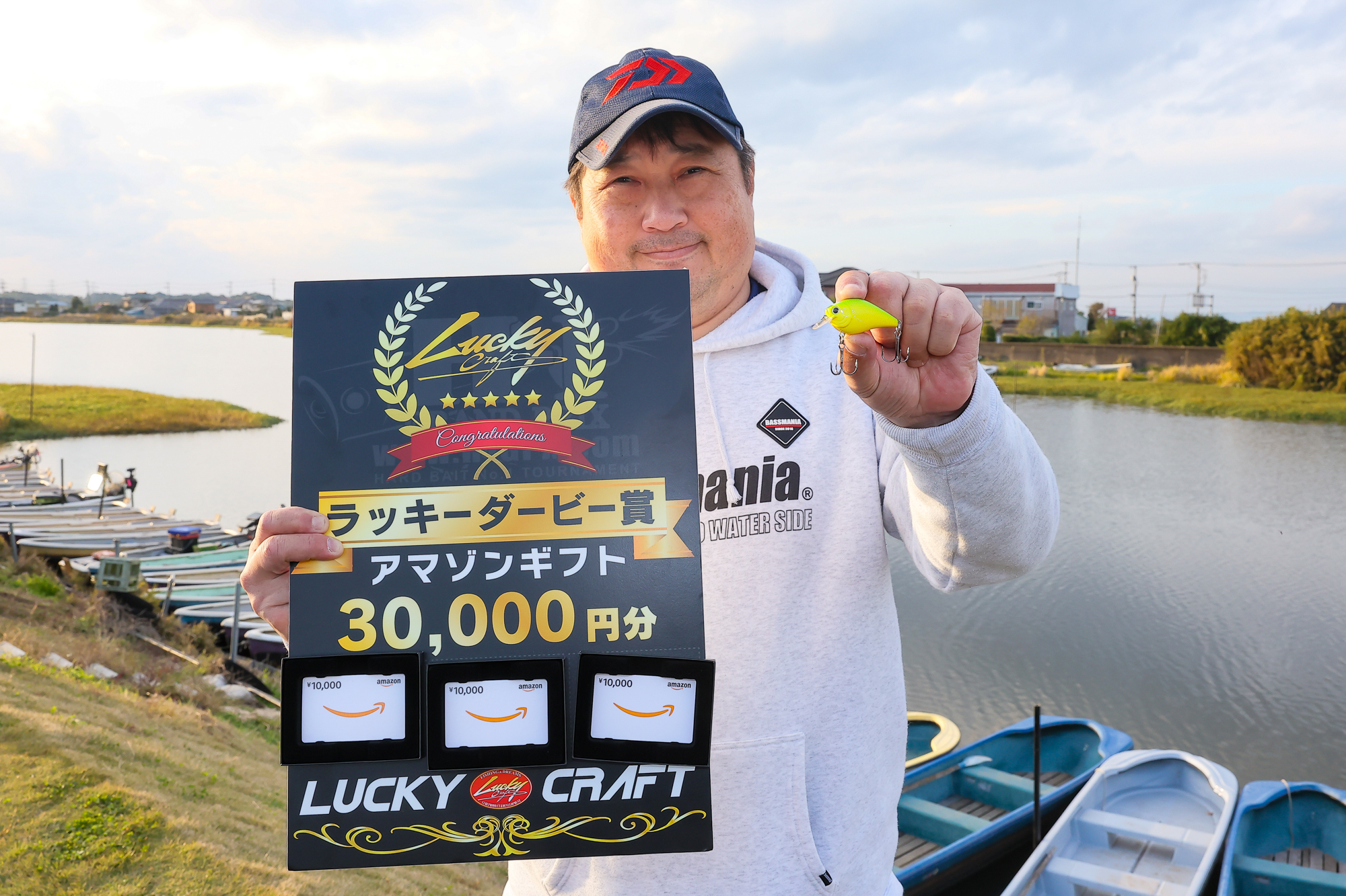 H-1スーパーイベント『ラッキーダービー』は『FAT CB BDS1』で990グラムのバスを釣りあげ見事4位入賞した『岩浅 安信』選手がラッキーダービーを獲得し『アマゾンギフトカード3万円分』が贈呈されました!